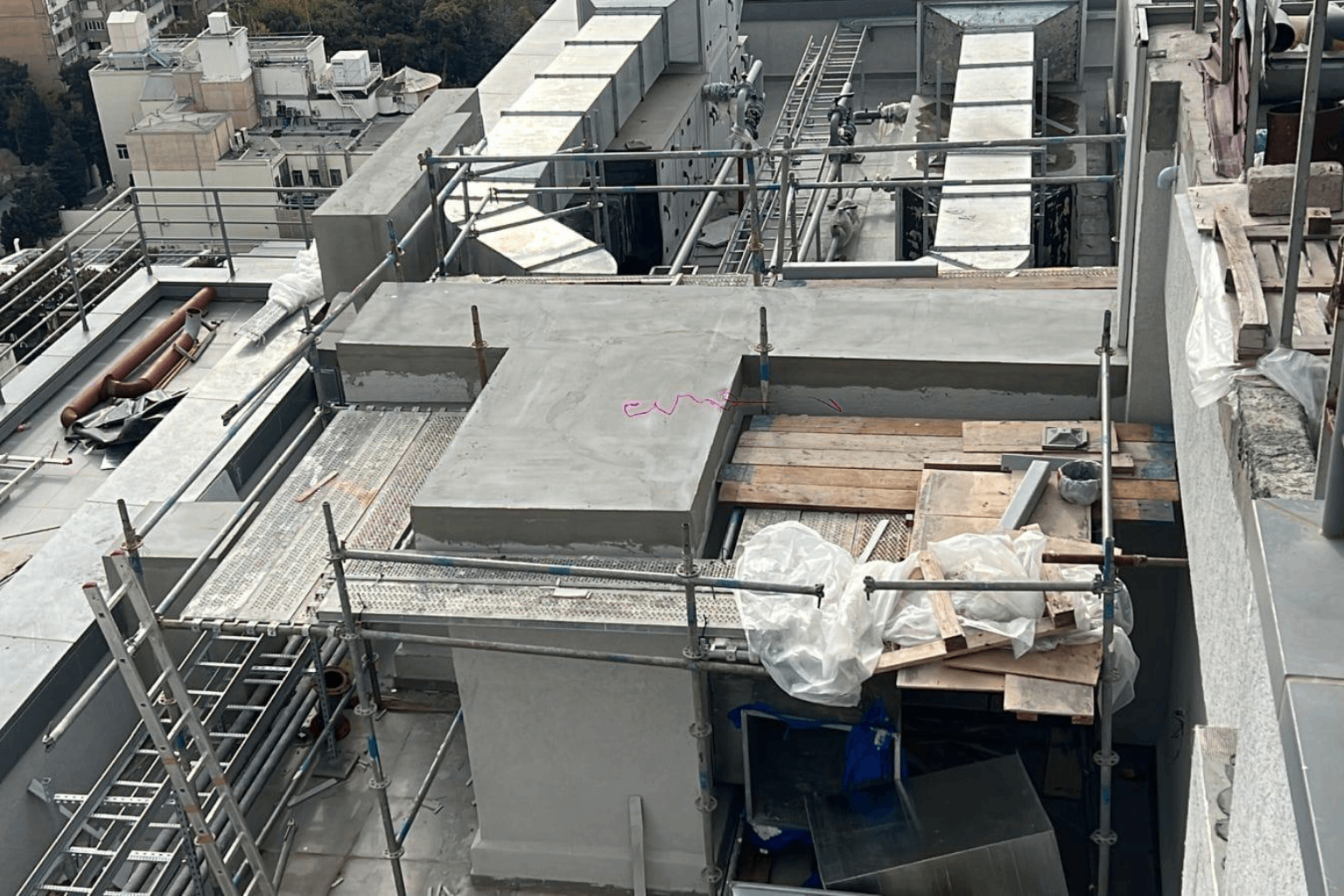 Concrete works were carried out on the rooftop to form the load-bearing surface and prepare for waterproofing. These works ensured long-term resistance to weather conditions and structural safety.