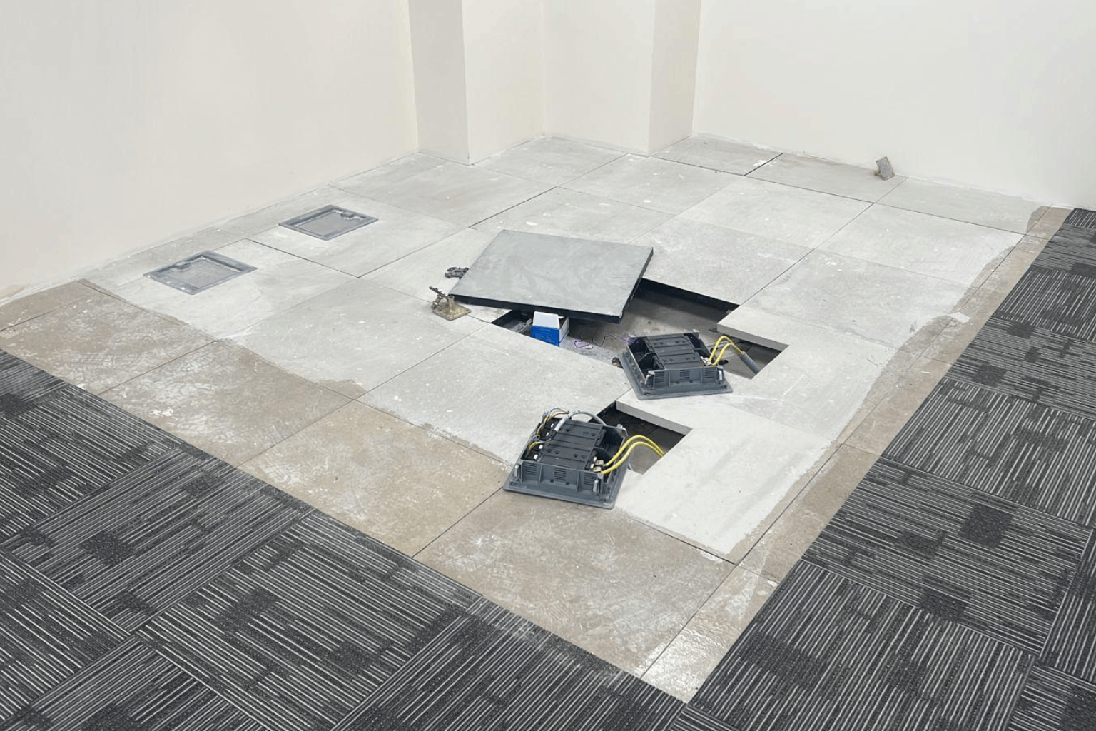 Raised floor systems were installed in office areas and technical rooms, allowing easy access to cable routes and utility lines. Durable carpet tiles were laid on top to provide comfort, acoustic performance, and a clean appearance.